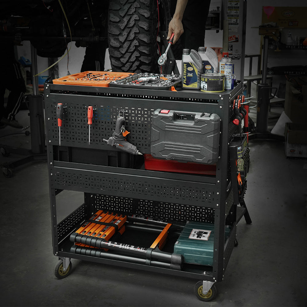- Large Capacity: Equipped with 3-tiered tool shelves, this tool organizer cart boasts ample storage capacity to accommodate all your tools. Furthermore, it incorporates a practical side panel featuring a pegboard design for each side, along with a comprehensive set of accessories including 4 pcs side organizers.