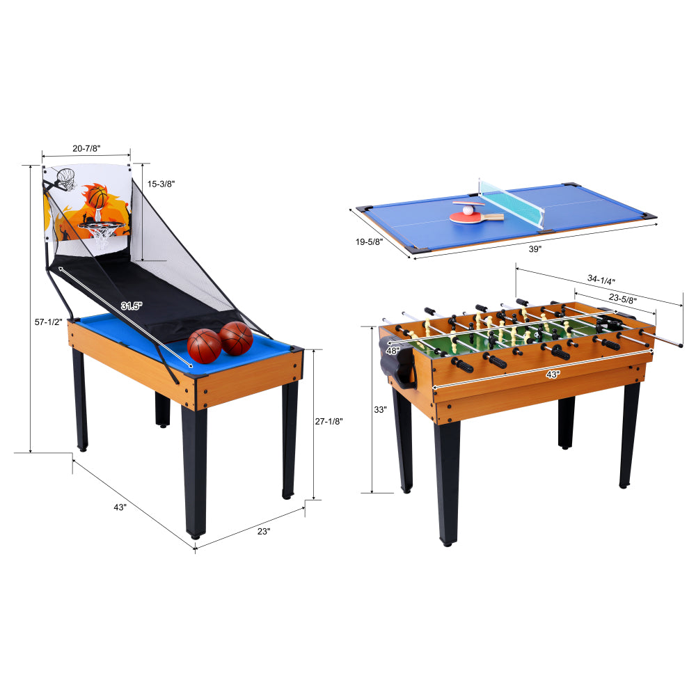 *Table size:1090*615*810mm *Playfiled 5mm thick MDF *Rods:12.7mm chrome hollow steel bar *Handle:Non-slip rubber handles *Legs:MDF + Iron tube Function:soccer, billiard,table tennis,hockey,baskball Includes: 2xbasketball, 2x cue sticks, 2x pushers and pucks 1x pingpang net, 2x football ball, 2x paddles and pong ball Billiard ball set, detachable hoop, detachable net