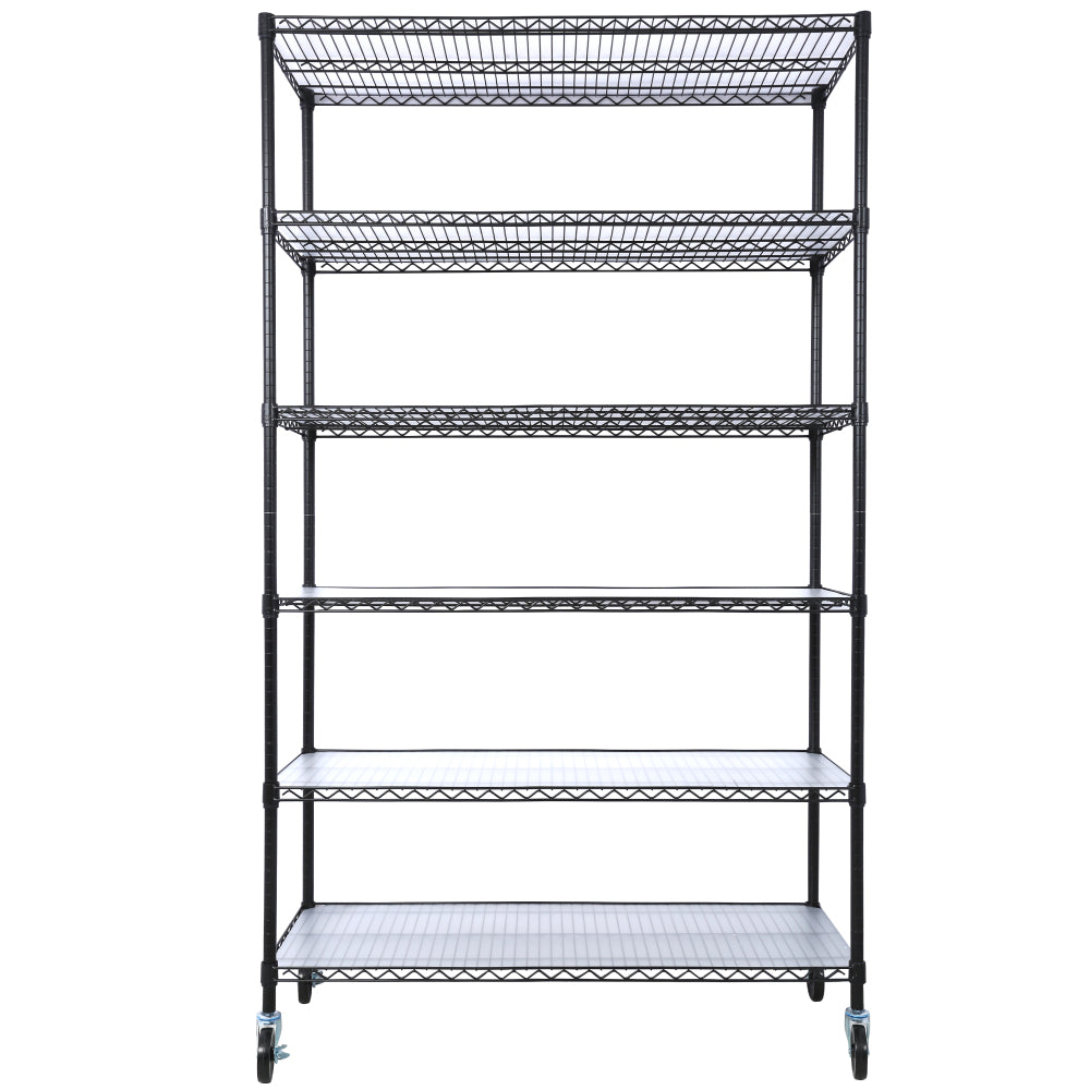 - Easy to Move: Our 6 tier garage shelves are designed with 4 leveling feet and 4 industrial wheels (2 lockable), allowing for easy movement and positioning in various spaces such as supermarkets, garages, closets, kitchens, and more. The height-adjustable leveling feet ensure stability even on uneven ground, and the non-slip design prevents scratching of floors.