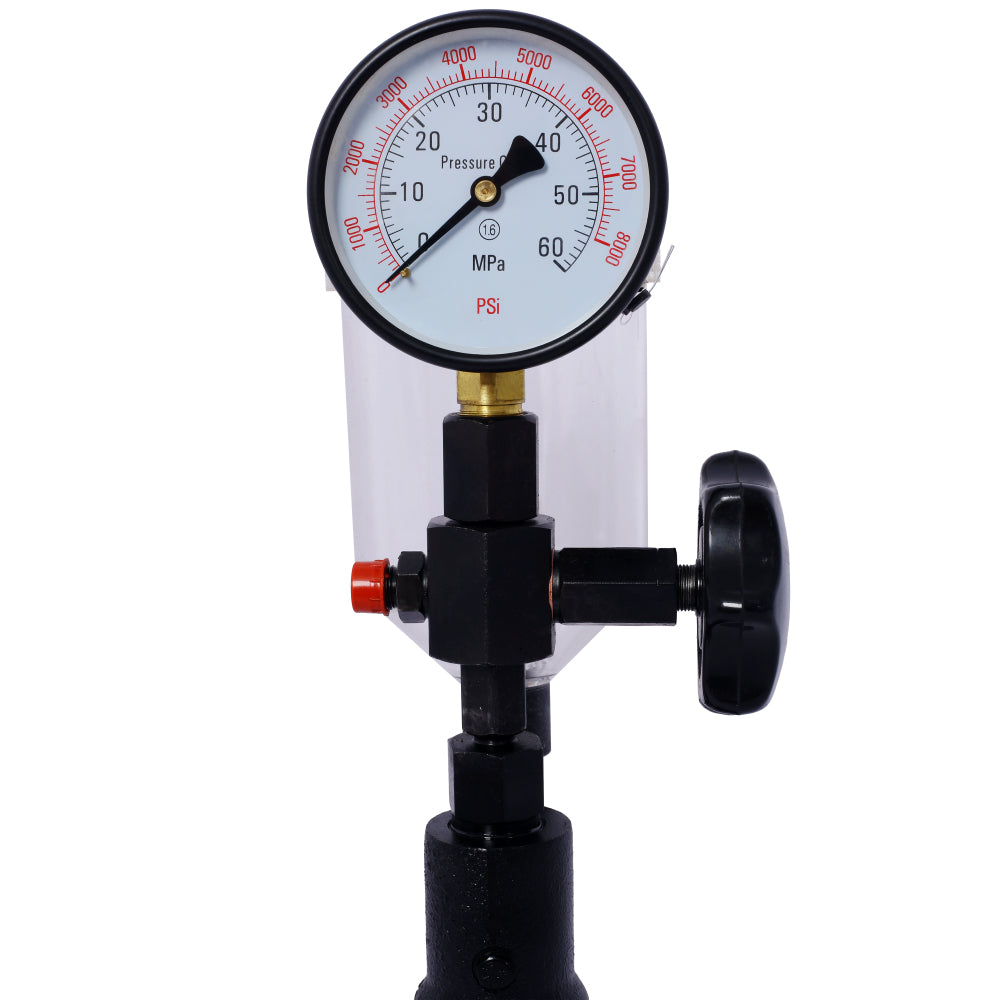 - Wide Measurement Range: Equipped with a precision dual-scale gauge, this tester measures from 0-600 bar/0-8000 psi, with a maximum test pressure of up to 60M Pa. The transparent fuel measuring cup holds up to 0.8L of oil, and features a built-in filter for accurate injector nozzle testing.
