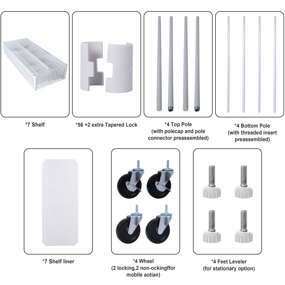 - Effortless Mobility: Our 7-tier garage shelves are equipped with 4 leveling feet and 4 industrial wheels (2 lockable), facilitating easy positioning in supermarkets, garages, closets, kitchens, porches, pantries, and more. The height-adjustable leveling feet ensure stability even on uneven ground, and the non-slip design prevents floor scratching.
