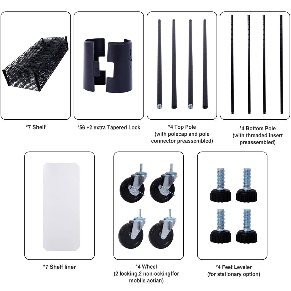- Exceptional Durability: Constructed from heavy steel, our wire shelving boasts excellent rust and oxidation resistance, ensuring unparalleled quality, longevity, and functionality. The wire shelf liner is of superior quality, thicker than the competition, and the entire 7-tier shelf unit has passed NSF certification, guaranteeing safety and reliability. This storage rack is the perfect addition to any home or office space.