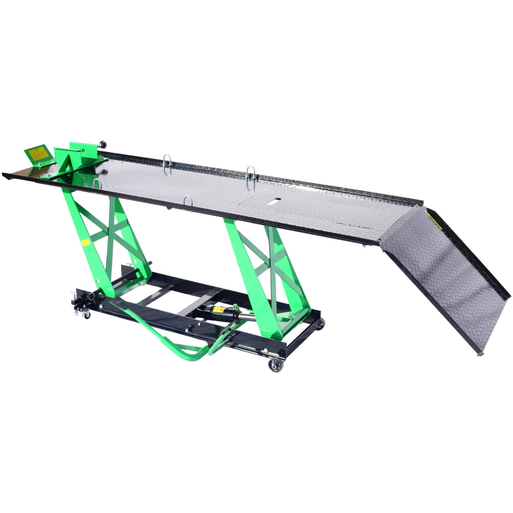 - Customizable Features: The lift table comes with a rear wheel drop-out panel, tie-down rings for added stability, and a large platform measuring 86.5" x 26.75" with a removable 26" ramp for easy access.