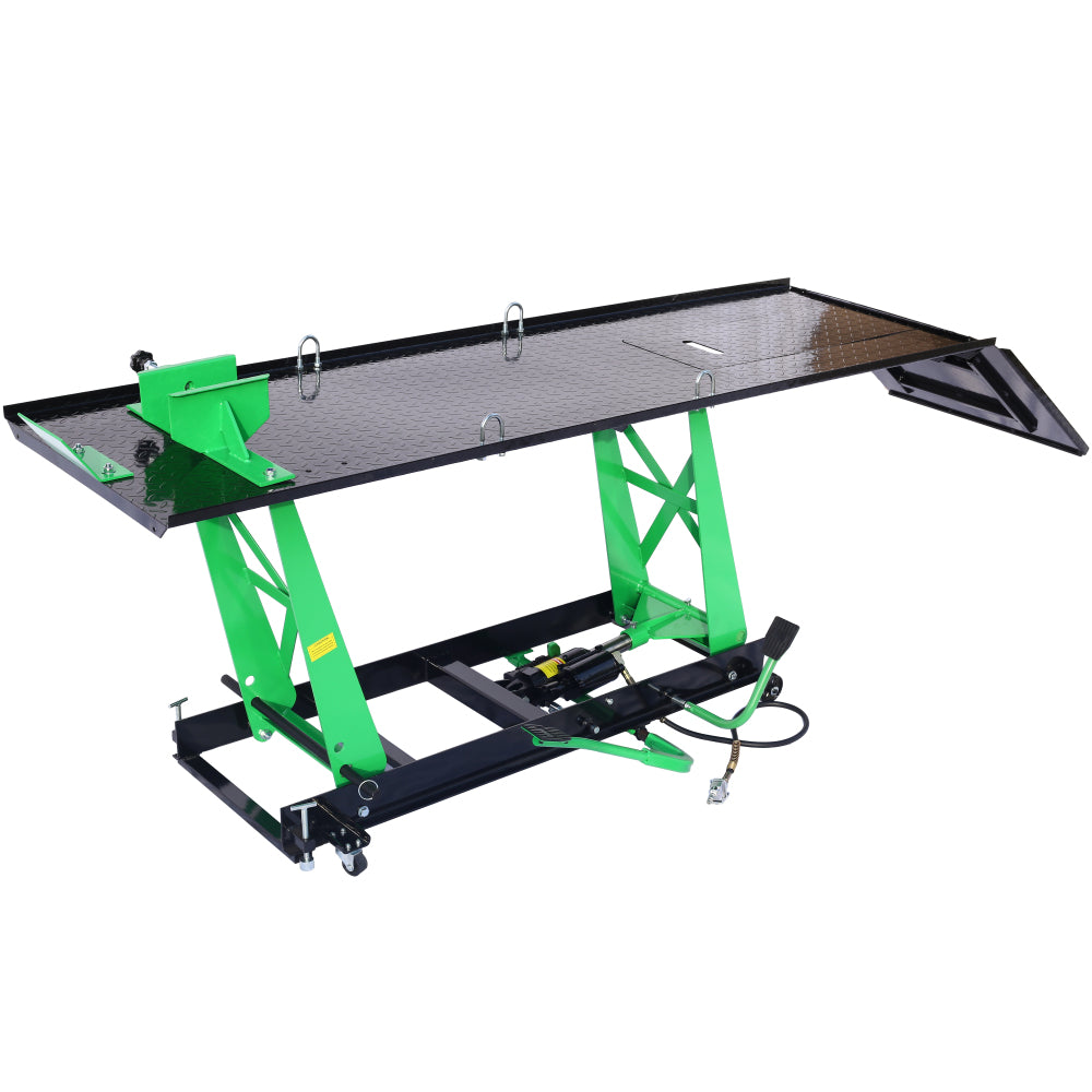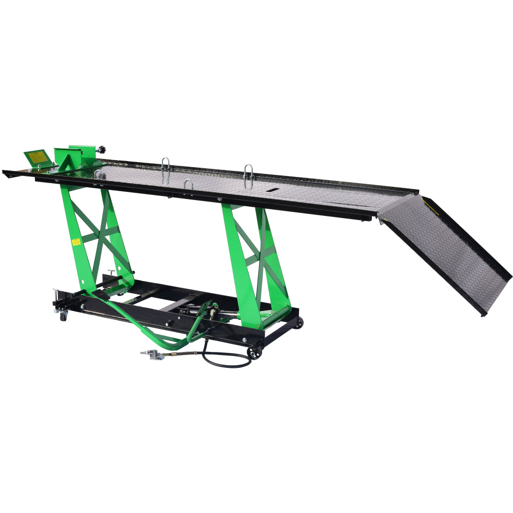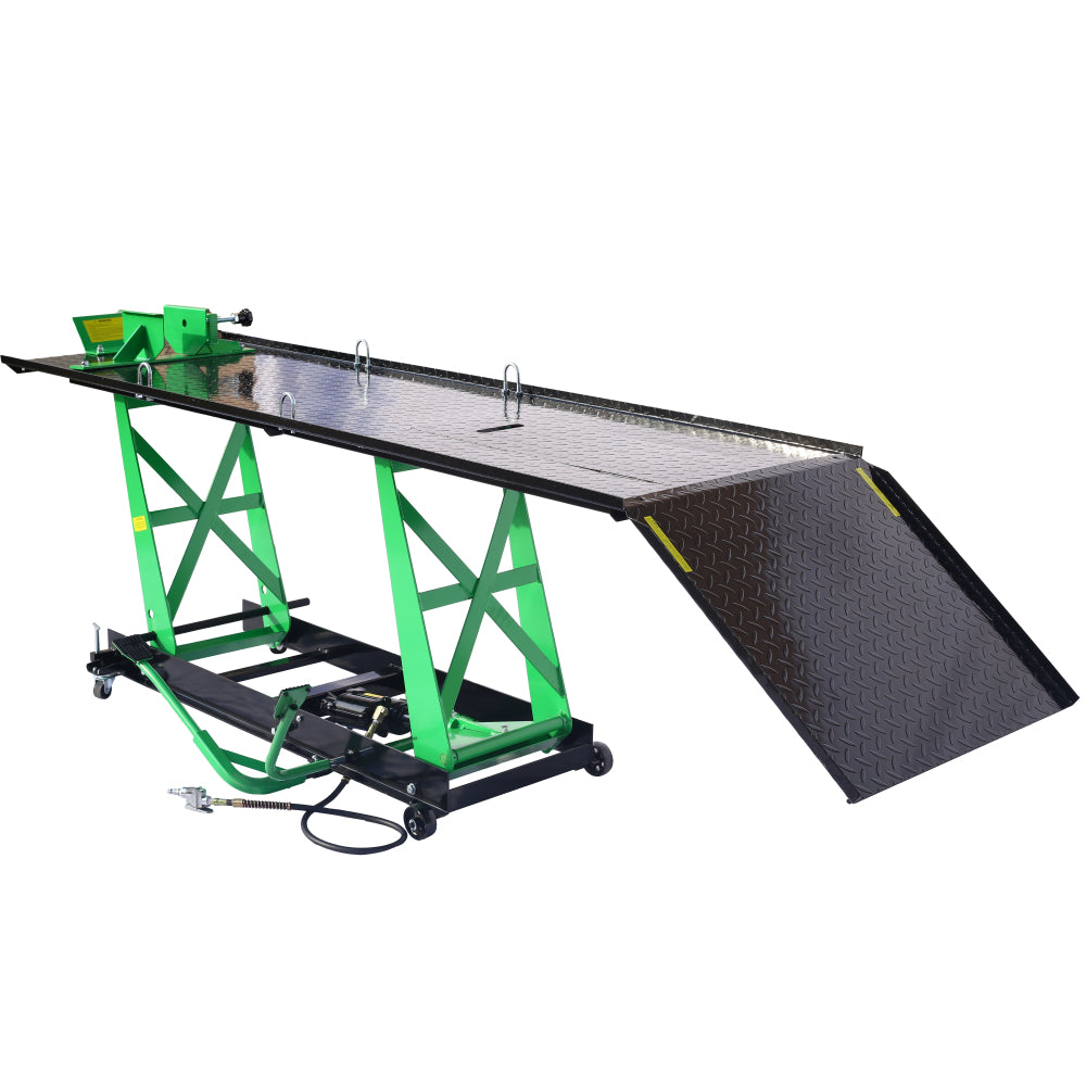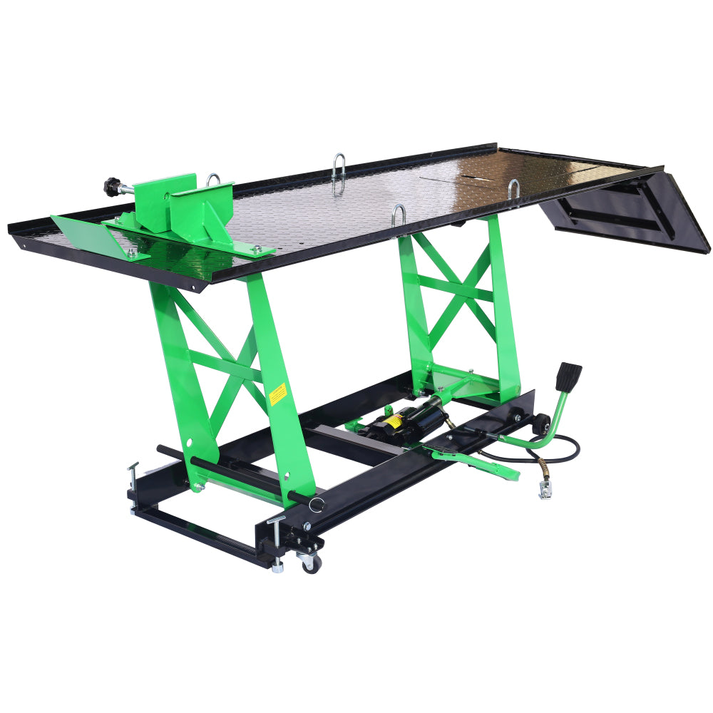 - Heavy-Duty Construction: Designed for durability, this motorcycle lift features a 12-gauge, powder-coated diamond plate deck for long-lasting strength and enhanced service life.