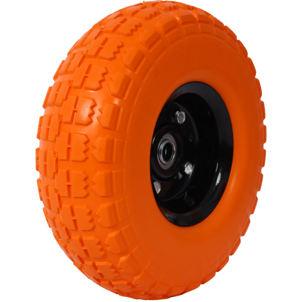 • Heavy-Duty Flat free PU foam Tire and Wheel - 4.10/3.50-4", 10" Diameter, 5/8" Axle Bore Hole, 2.2" Offset Hub and Double Sealed Bearings for Hand Trucks Replacement,orange color
