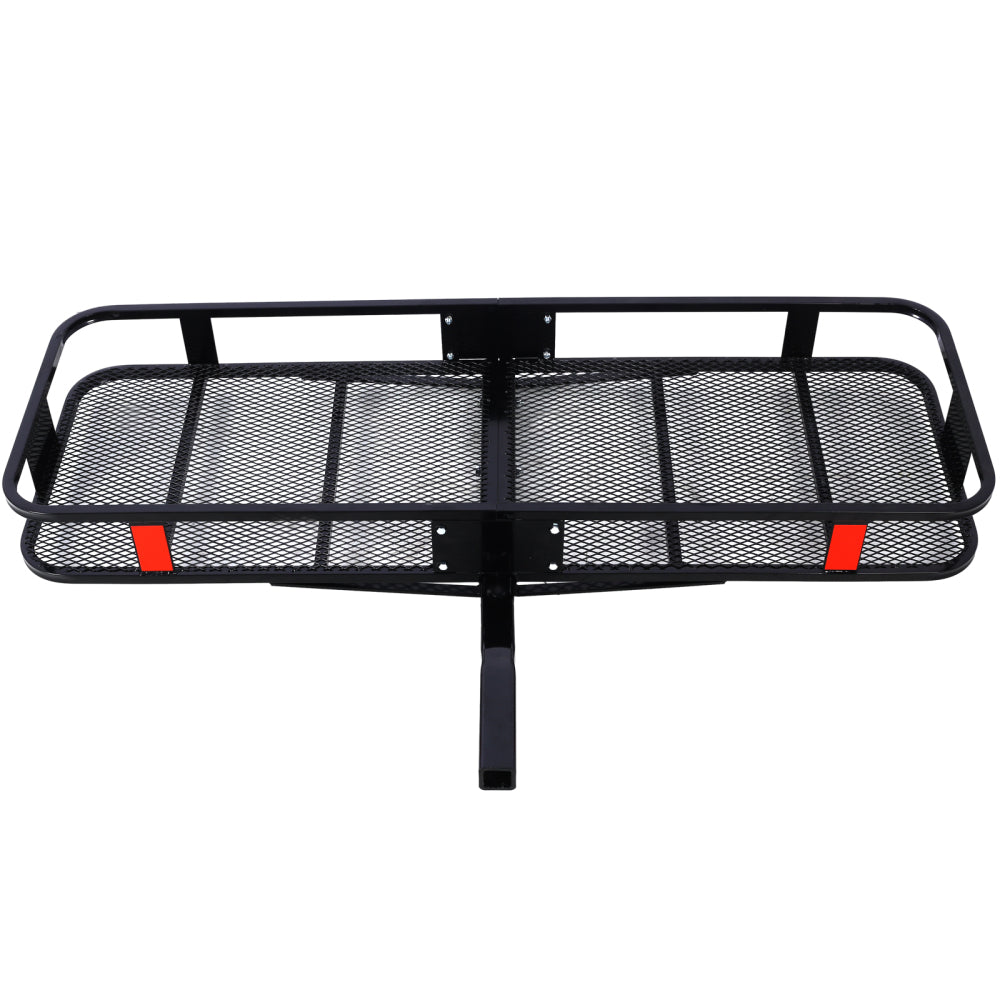 The Cargo Basket measures 60" long x 21" wide x 6" tall and has a maximum weight capacity of 500 lbs. It can be easily folded up when not in use, saving space during storage. This basket is compatible with cars, SUVs, vans, trucks, and Jeep Wranglers that have a 2" receiver hitch. It features a 2" shank rise for improved ground clearance. The basket is constructed with heavy-duty steel and has an Anti-Rust Coating to prevent corrosion.