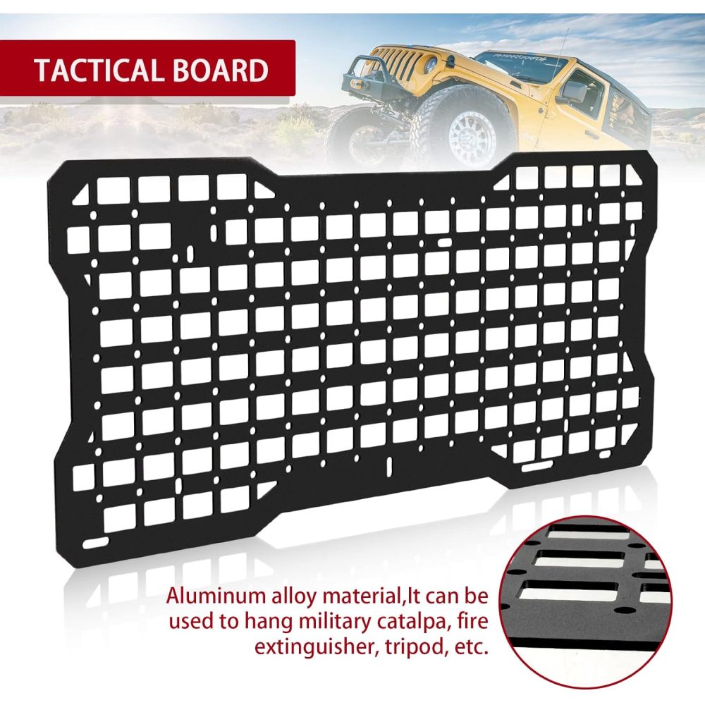 - The MOLLE Panel allows storage in unused side space; Reliable mounting solution for your off-road tools: fuel tank,molle bags, trail gear, high lift jacks, hunting gear, fishing equipment or shovels