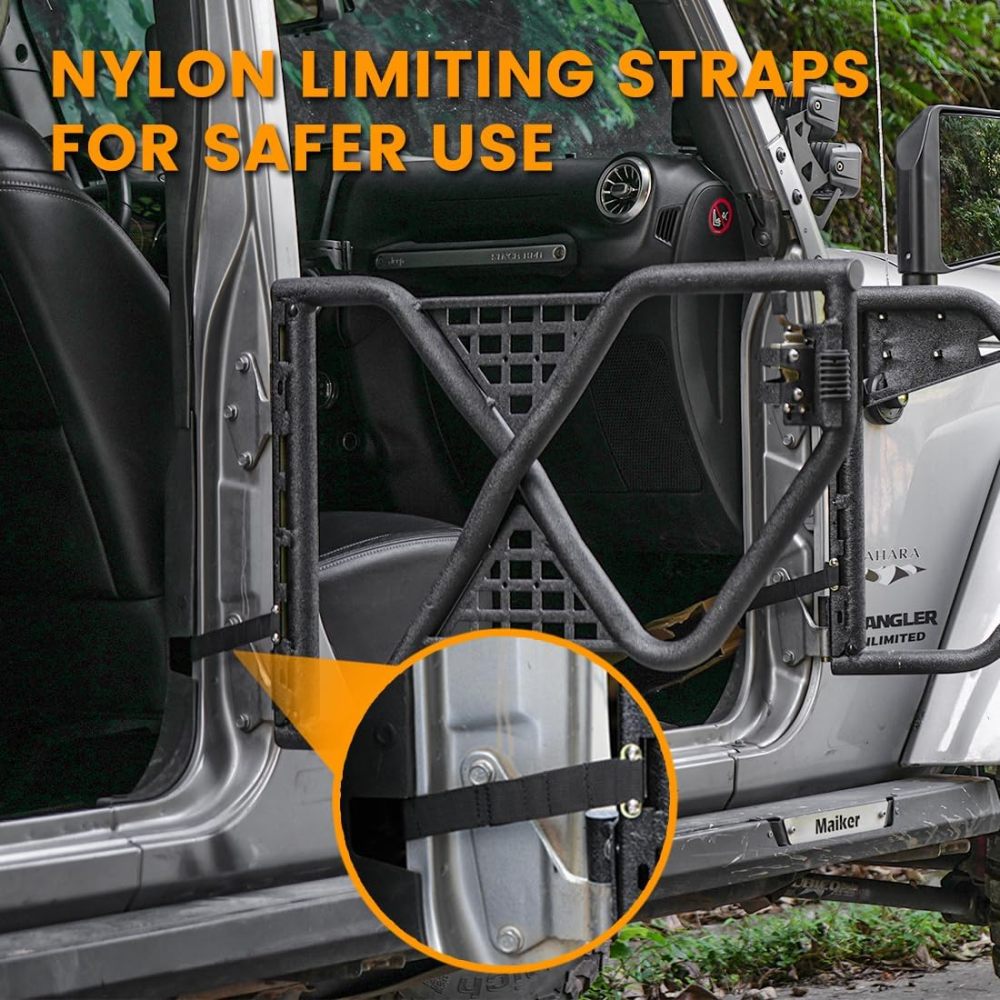 - The Steel Tubular Door is intended for Summer Off-road Trail Adventure use. they provide excellent visibility and ventilation.You have the best first visual experience and thrilling off-road atmosphere when challenging obstacles.No worry about damaging the original door when off-road.It's not a safety restraint device,please make sure sto fasten your seat belt to avoid sharp turns and other dangerous movements.