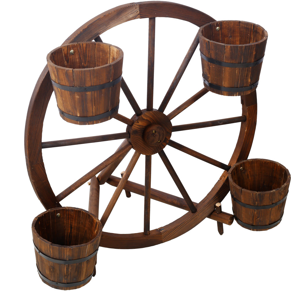 - Wagon Wheel Barrel Design: Featuring a classic wagon wheel with four metal-banded barrels, this planter brings rustic charm to any setting.