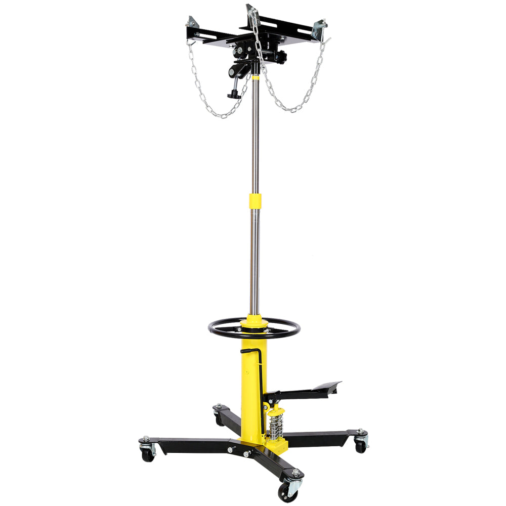 [TWO STAGE TRANSMISSION JACK] - telescopic two-stage hydraulic ram, wide 4-leg base with swivel casters for stability and easy movement. Foot pedal easily raises qiuckly under load and provides safe and controlled lowering of load